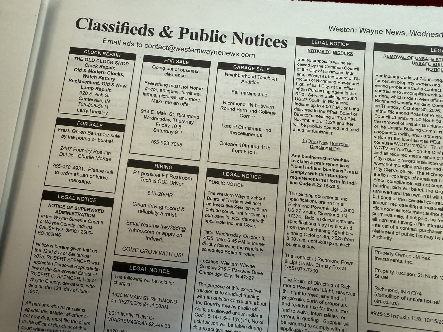 Legals in the Western Wayne News are 9 Pica, 0 Point Column, Type Size 7. Rates are based on allowable amounts set by the Indiana State Board of Accounts.