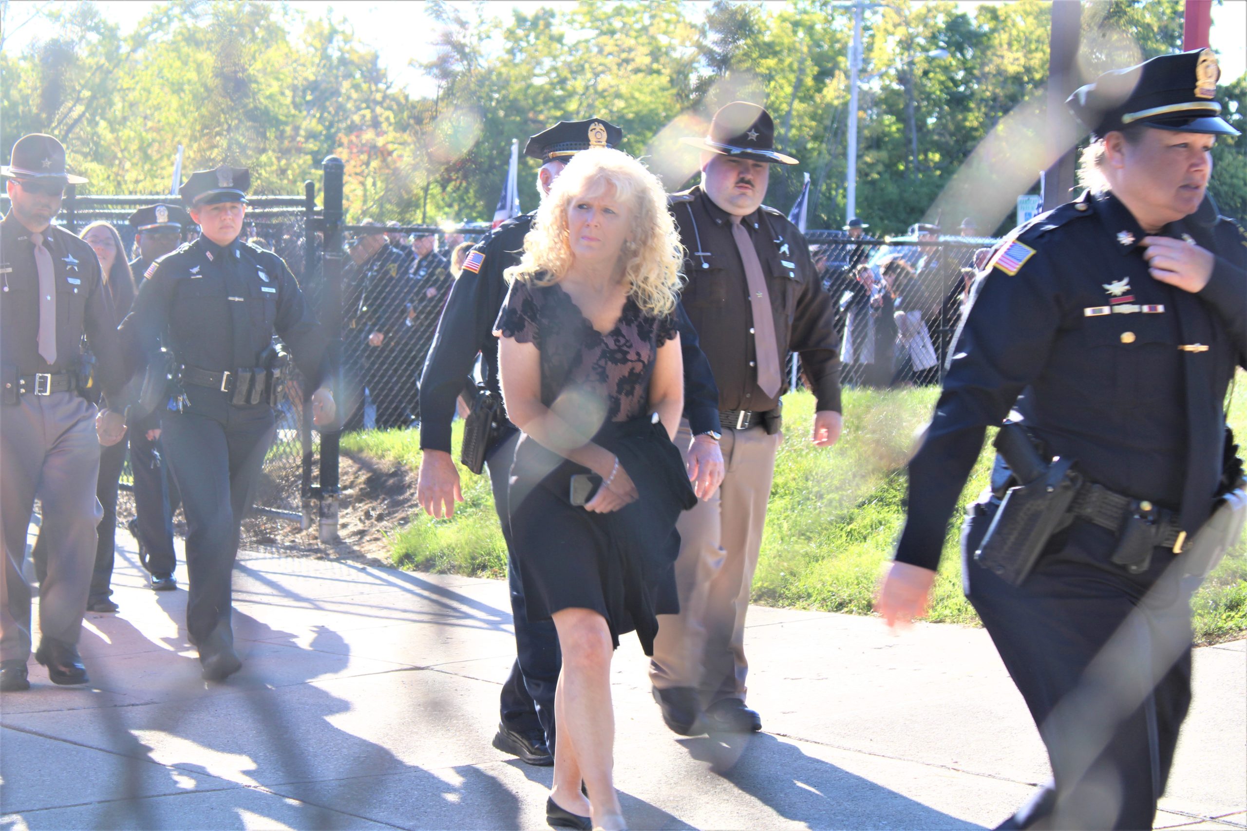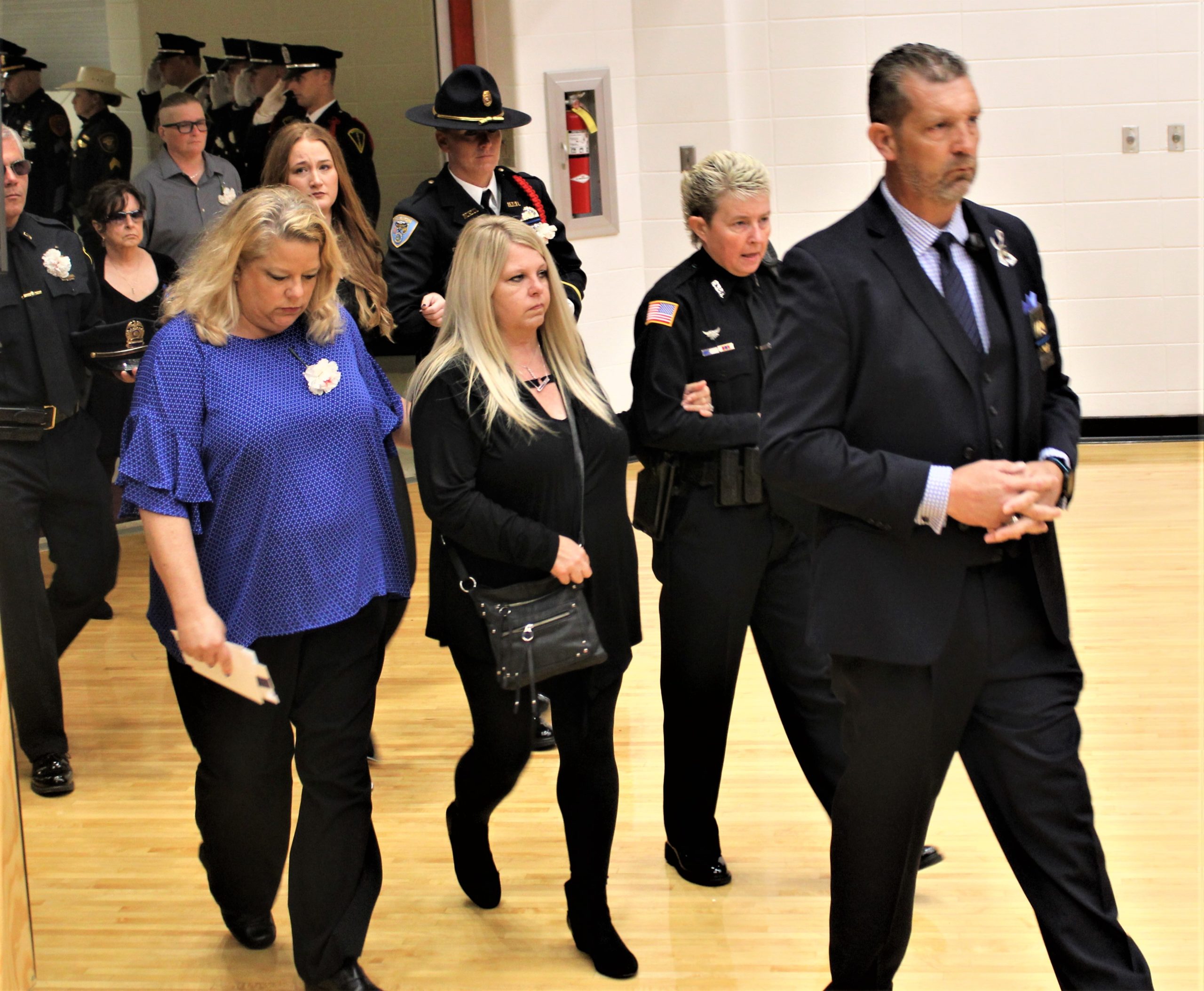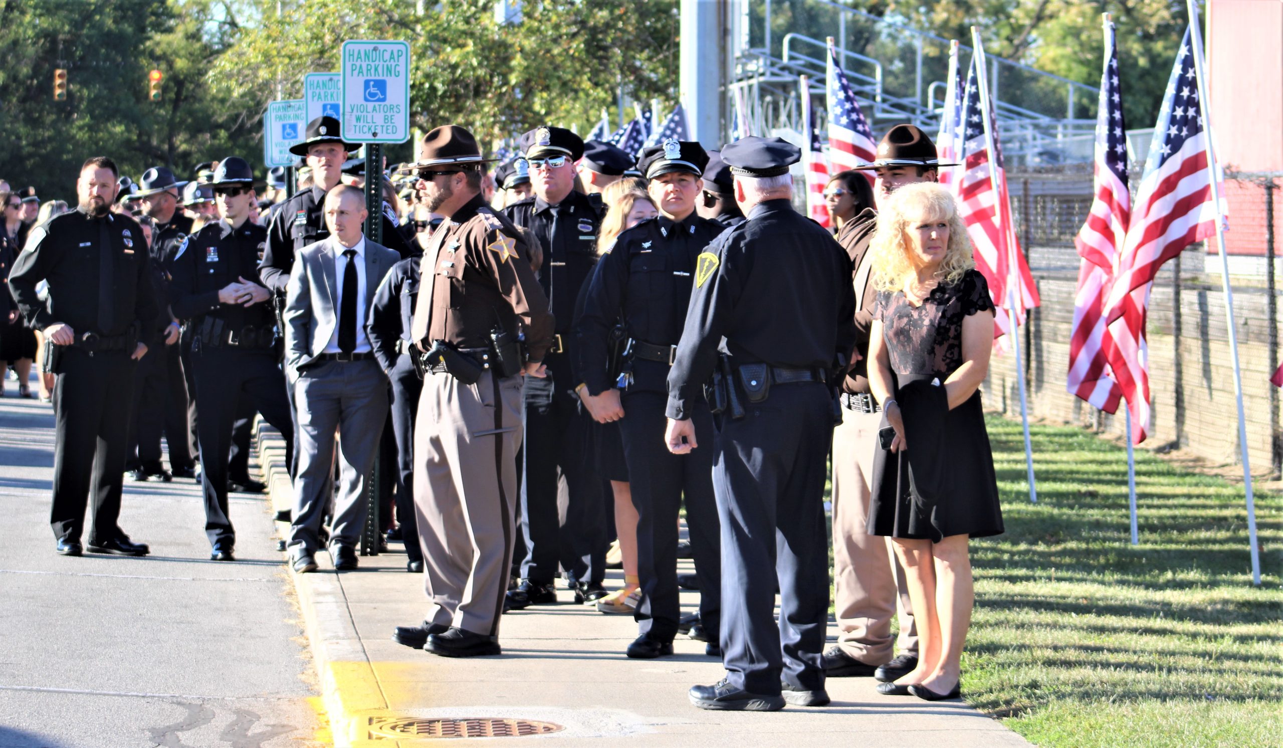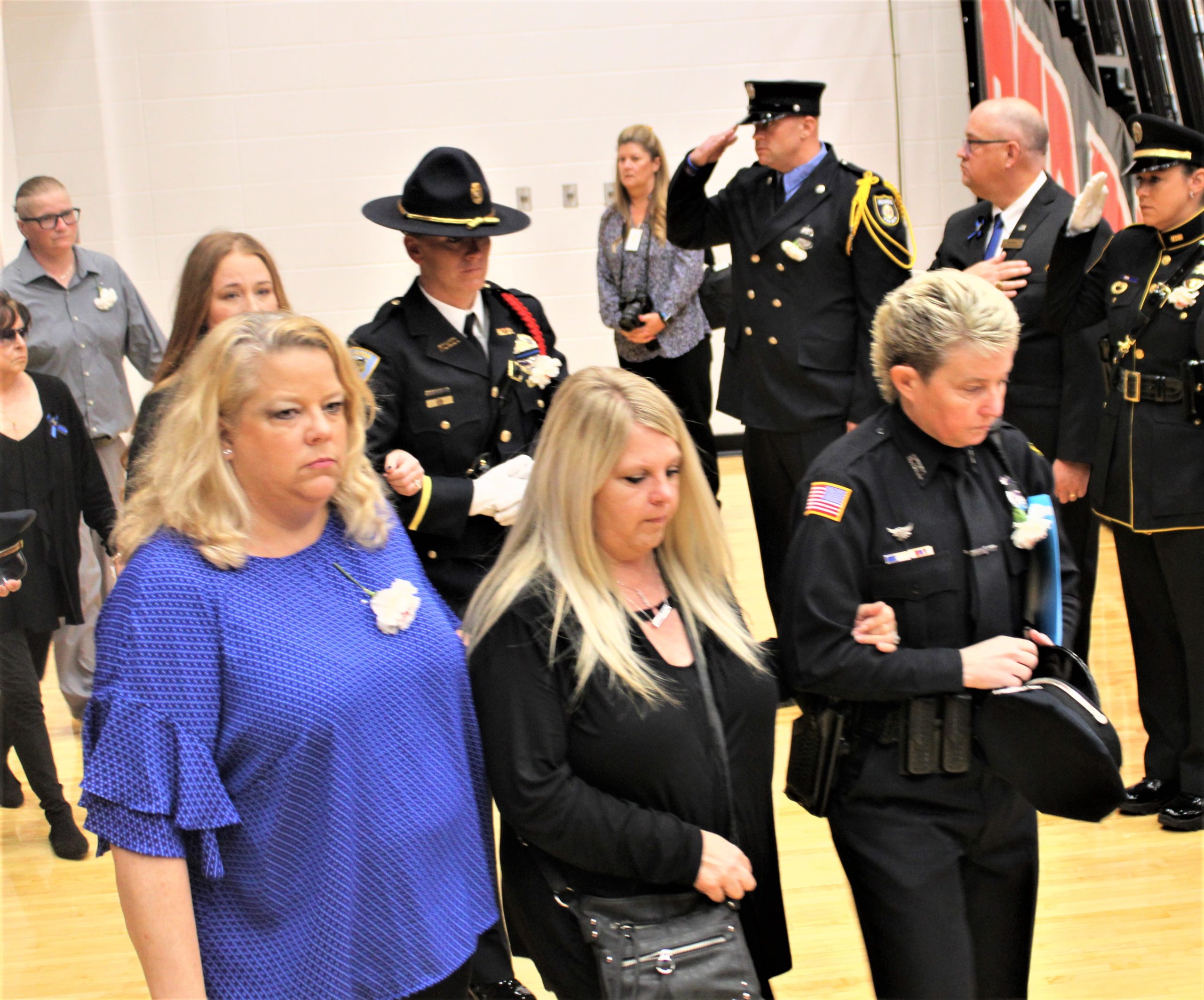 Wayne County Sheriff’s Department employees enter the funeral for RPD K-9 Officer Seara Burton at Richmond High School’s Tiernan Center.