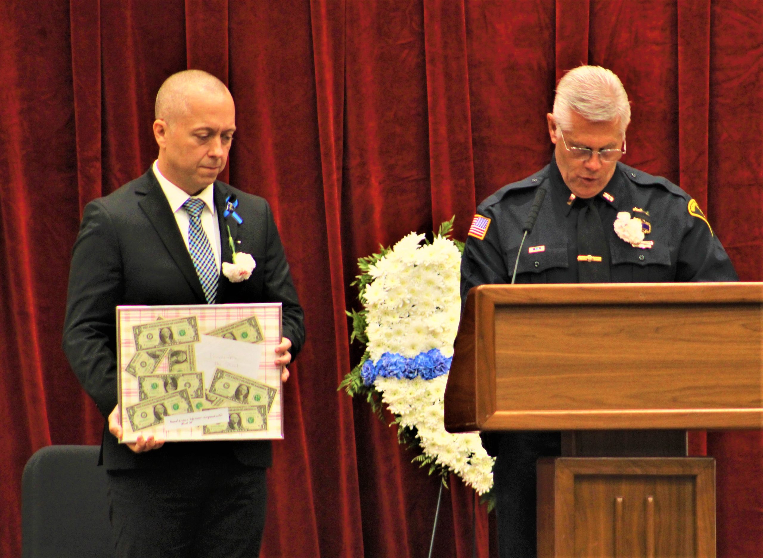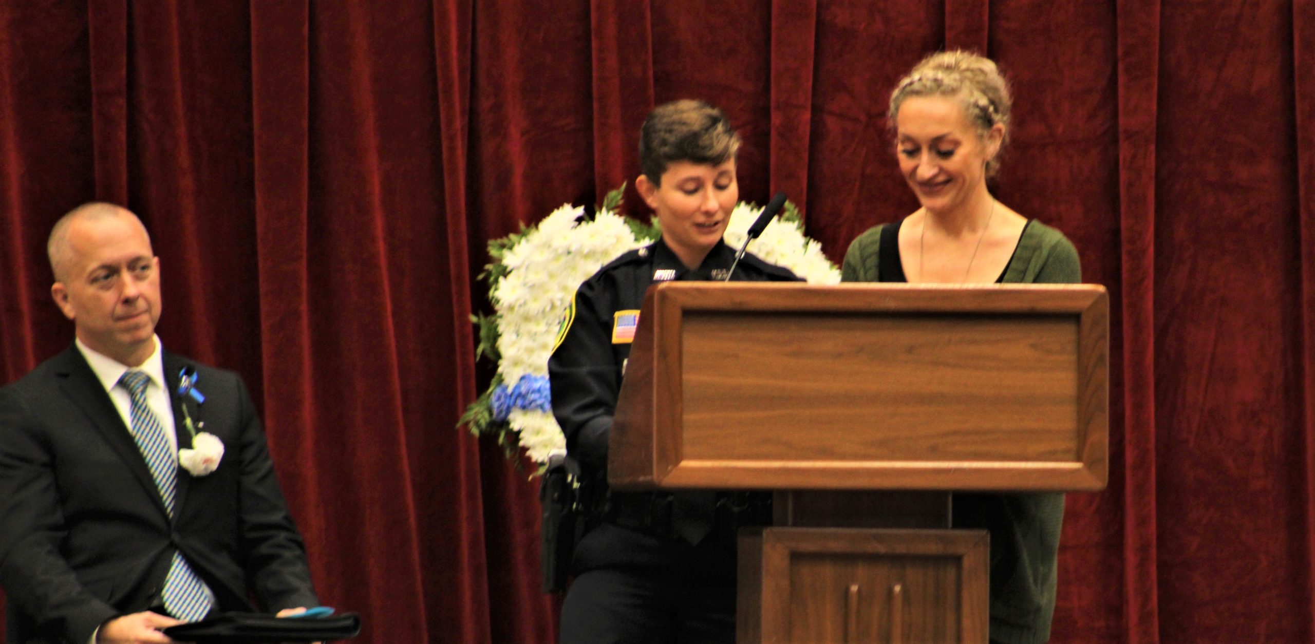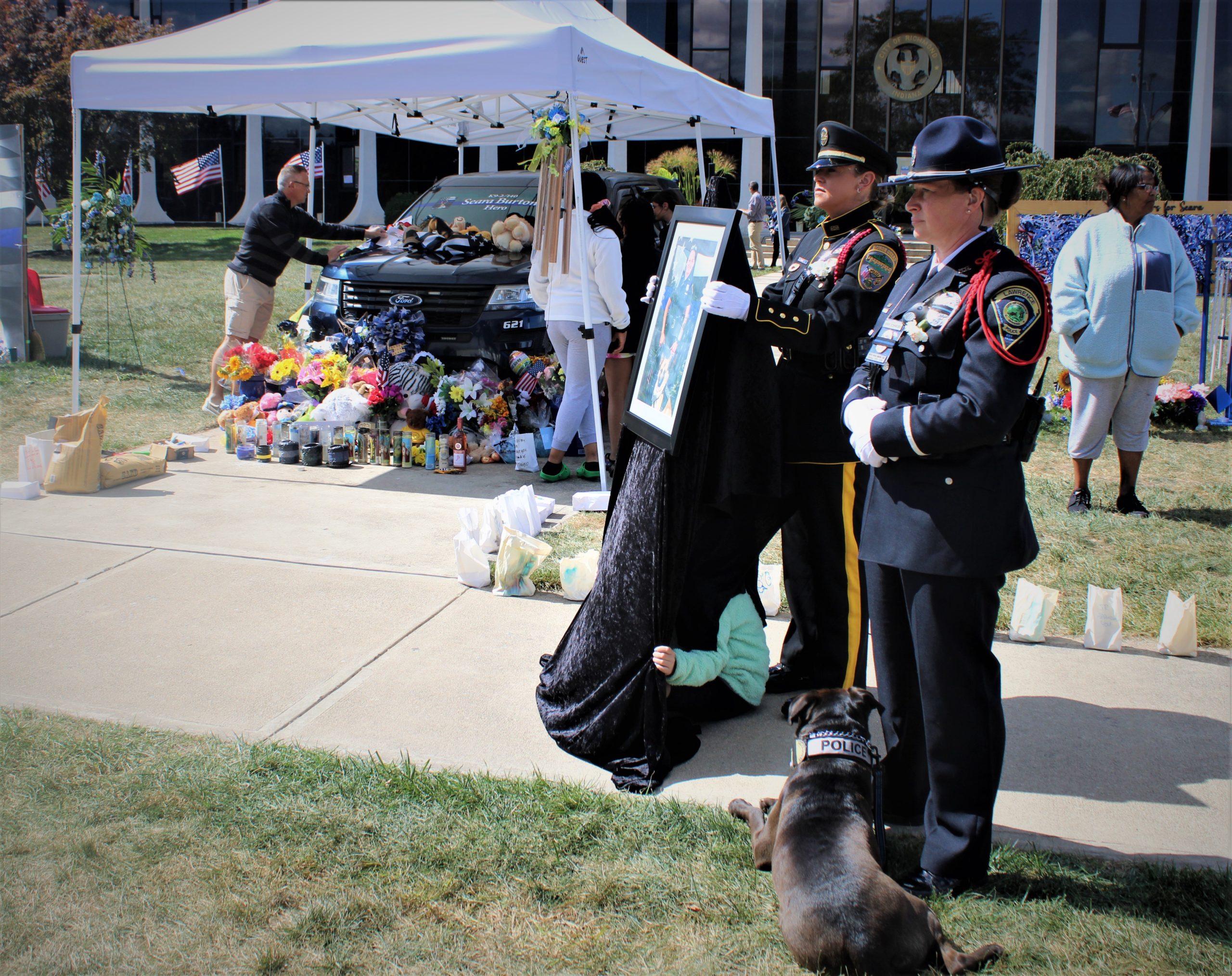 Tina and Herb Chavis listen to the final dispatch call for RPD K9 Officer Seara Burton.