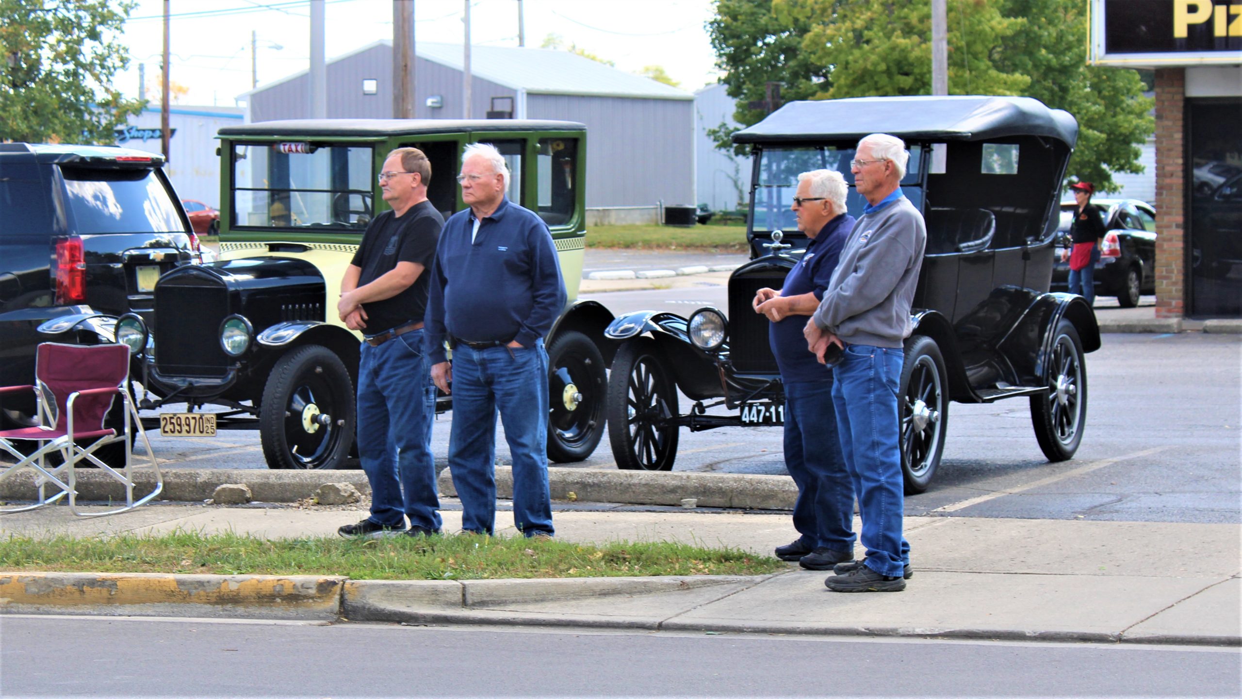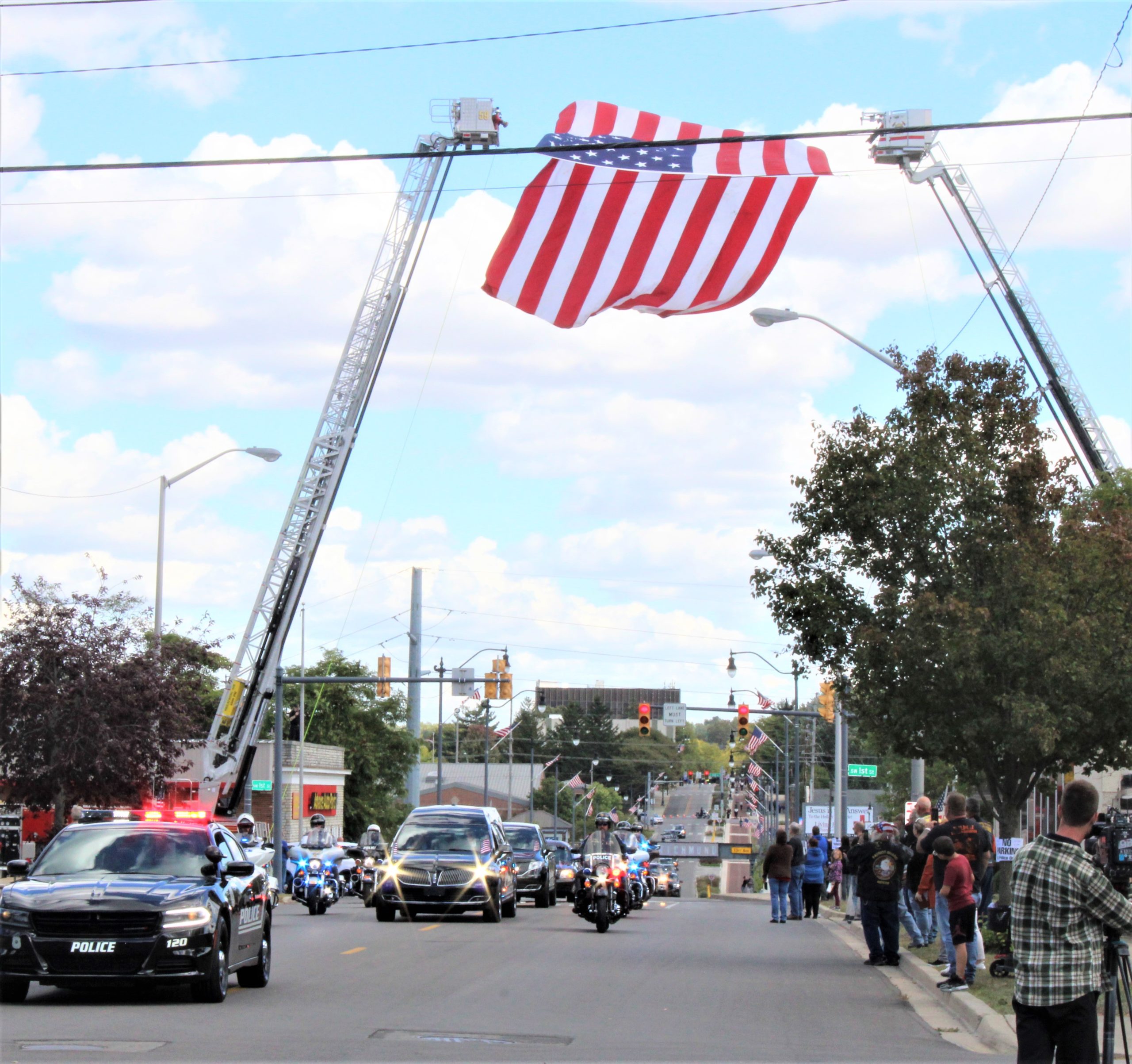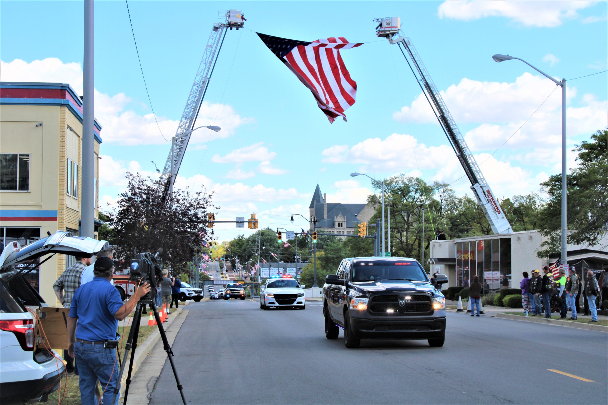 Wayne County Sheriff’s Office vehicles travel west under the 40×60 foot flag near Community Family Funeral Home, right.