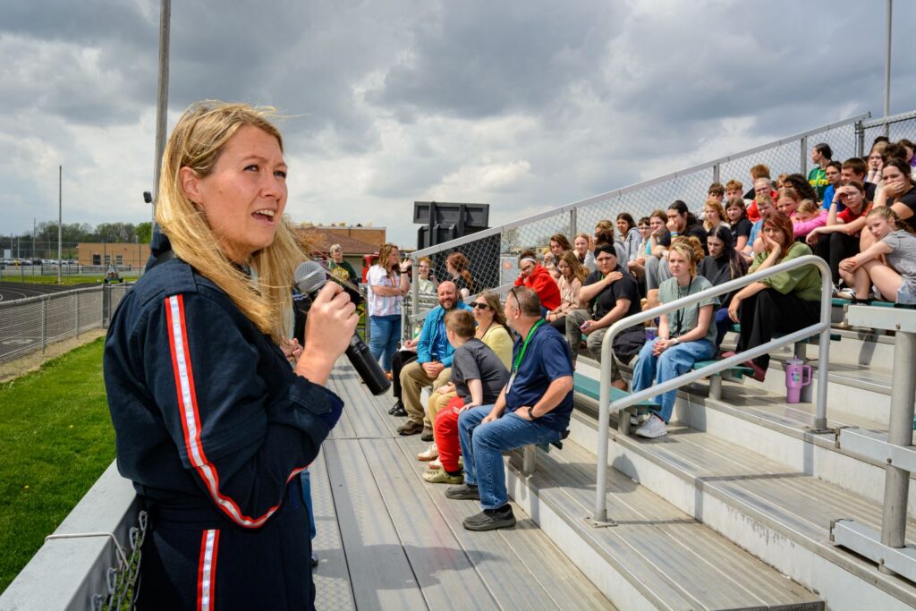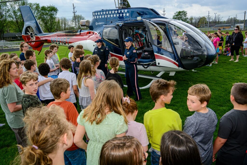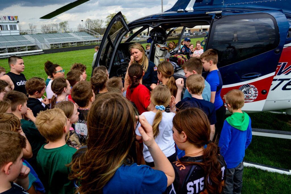 Cassandra Addington, an emergency department nurse practitioner and flight nurse with Reid Health, talks with Northeastern Wayne Schools students after they watched a care flight helicopter land at the high school April 15. “I love being able to save lives with the skills and training I have,” she said.