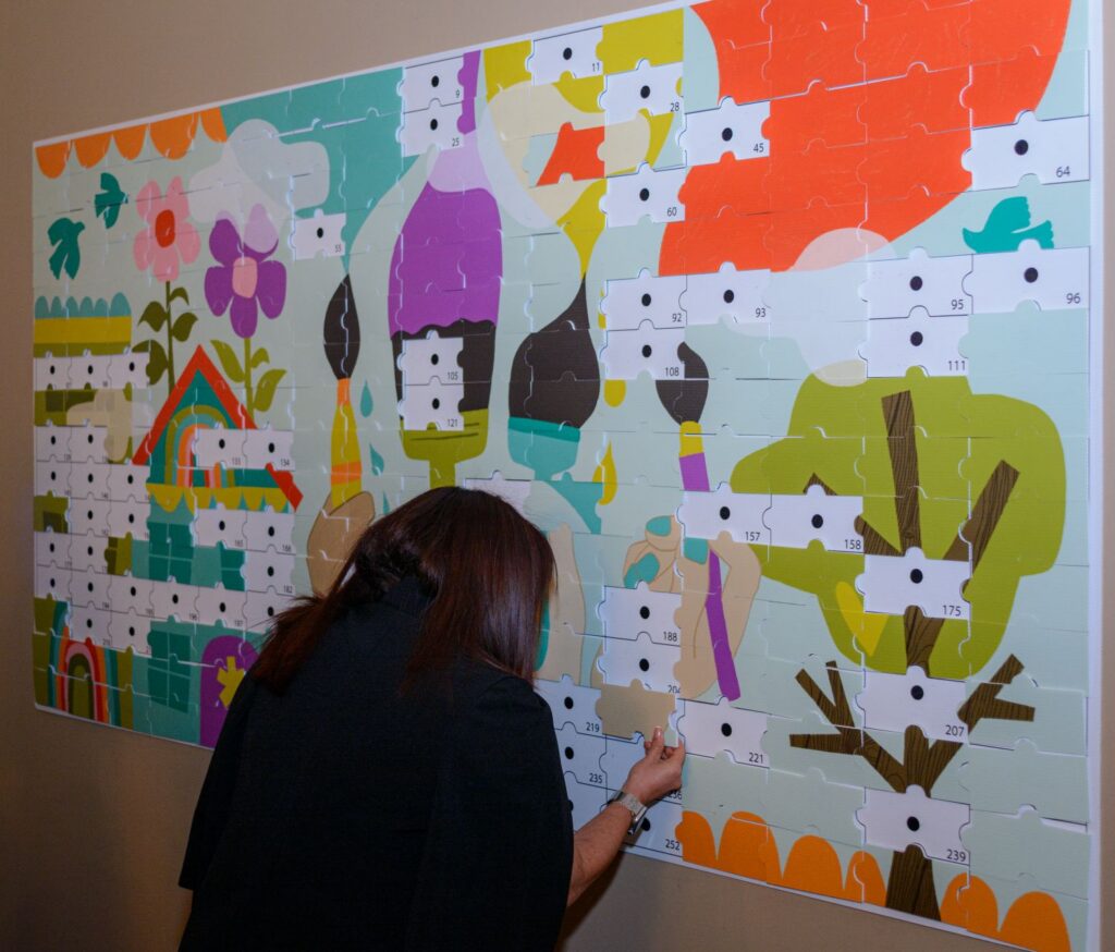 A puzzle piece is placed on a live art experience during the Women’s Fund of the Wayne County Foundation Annual Luncheon and Art Auction Saturday, March 14, 2026, at Forest Hills Country Club in Richmond, Ind.