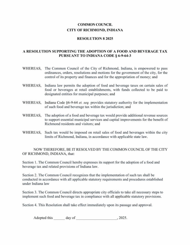 The Indiana General Assembly this year passed a law that included Indiana Code 6-9-64, which permits Richmond to enact up to a 1% tax on certain food and beverage sales within city limits. If adopted, the tax would apply to food and beverage sales at restaurants, bars and cafes; catered events; and hot food or prepared items sold at grocery store delis.