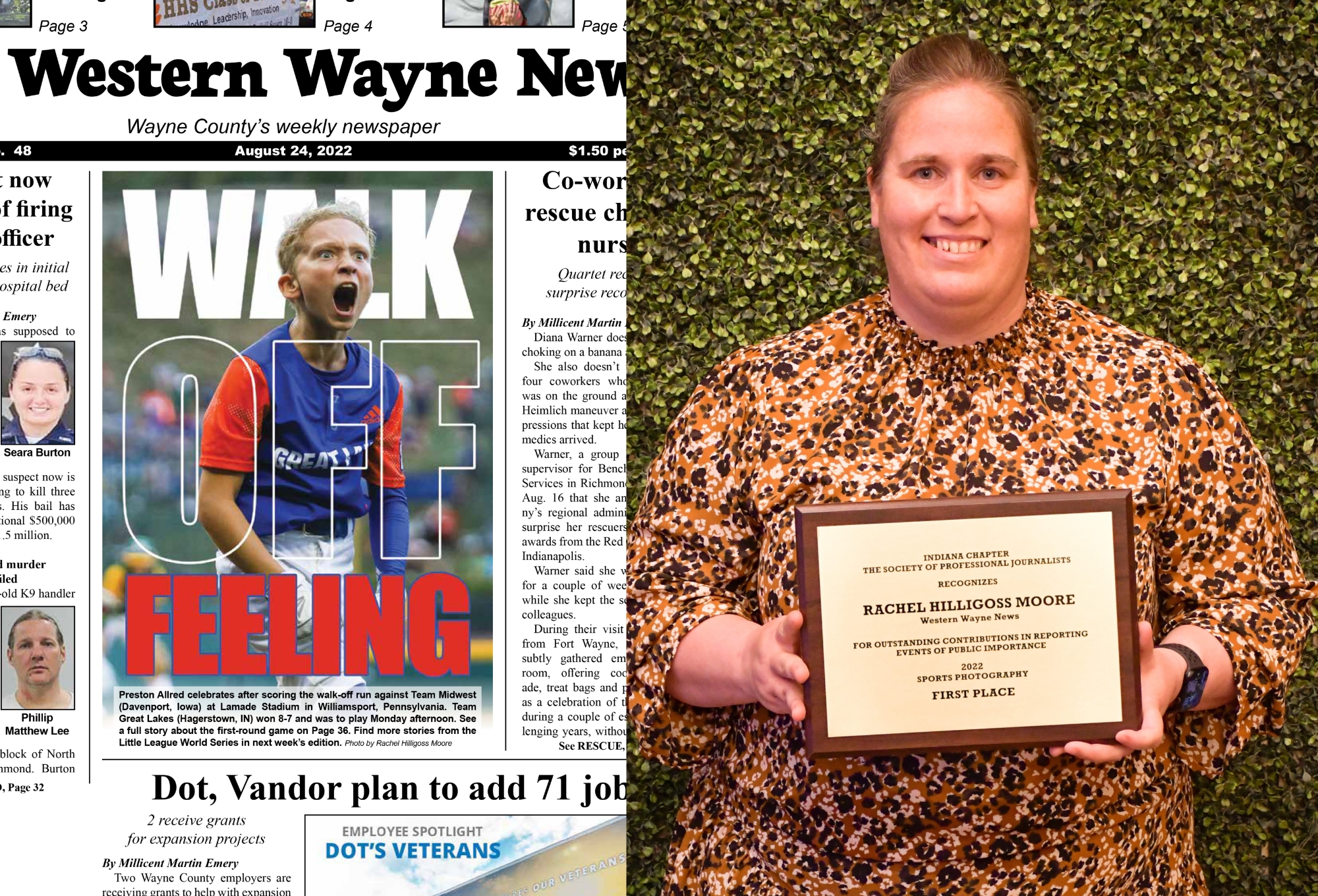 Winning first place in sports photography for publications with a circulation of 10,000 or less was WWN photographer Rachel Hilligoss Moore’s “Walk Off Feeling” photograph of Hagerstown’s Preston Allred, celebrating after scoring the walk-off run against Team Midwest during the 2022 Little League World Series. The photo appeared in the August 24, 2022 issue of the Western Wayne News.